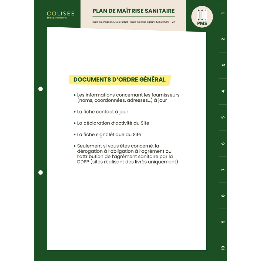Intercalaires du Classeur Plan de Maîtrise Sanitaire PMS